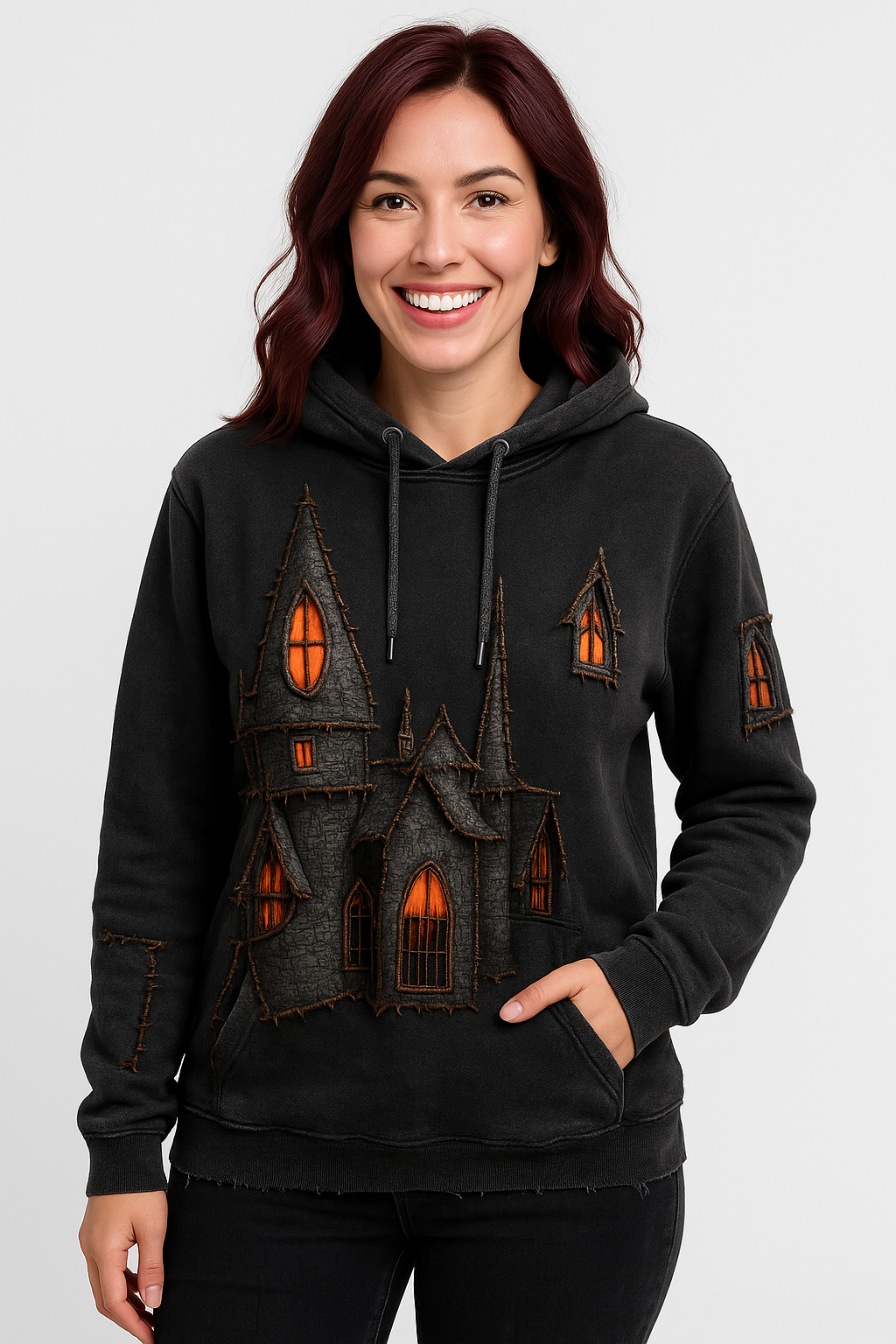 Add a hauntingly fun twist to your wardrobe with the Zosia Spooky Castle Patchwork Hoodie. Featuring a detailed castle design with glowing window accents, this hoodie blends casual comfort with Halloween charm. Its soft, durable fabric and relaxed hoodie collar make it the perfect piece for cozy nights, seasonal gatherings, or everyday wear with a playful edge.